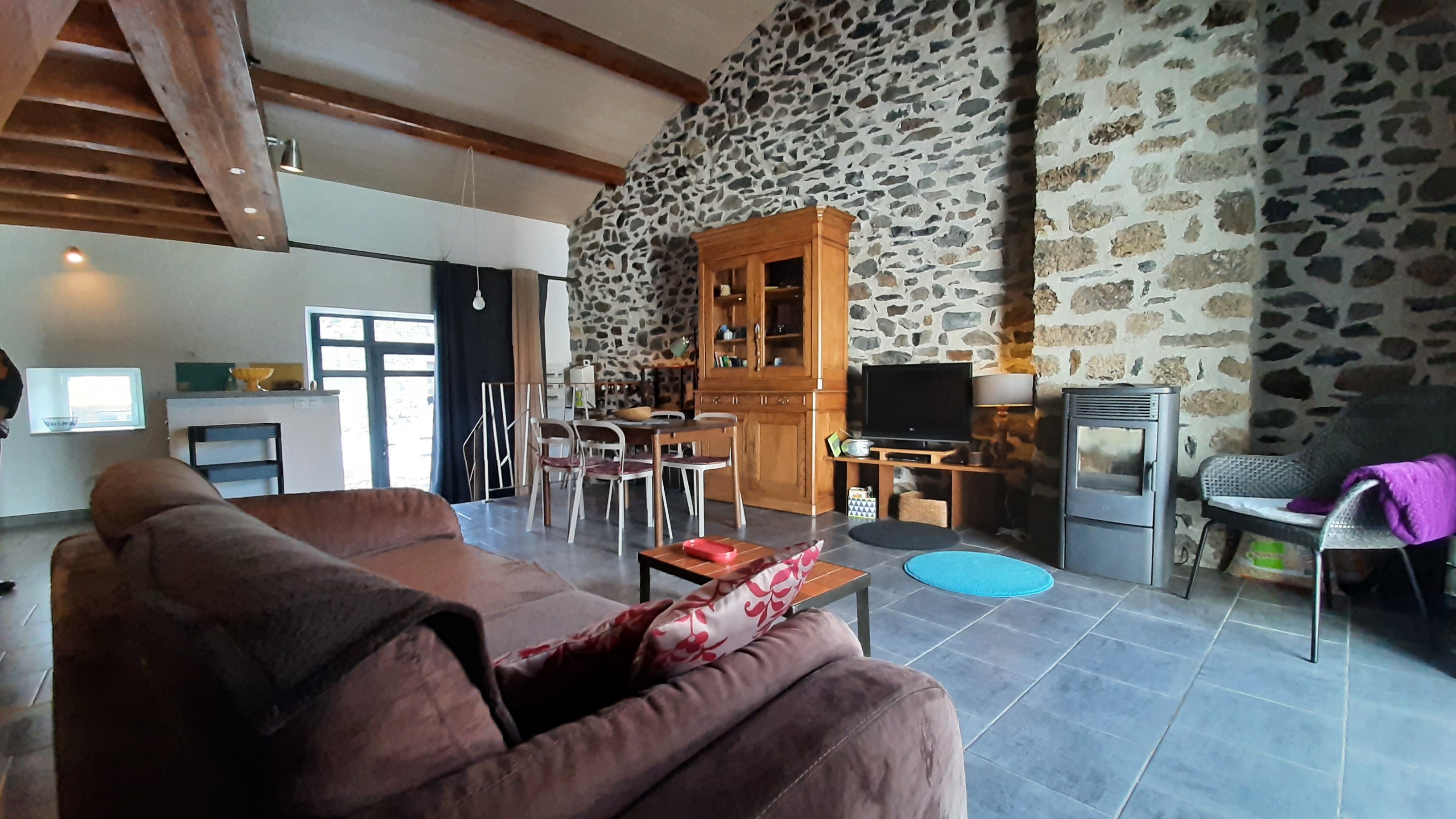 Accès par l'ancienne montée de grange : grande pièce à vivre avec poêle à granulés de bois, cuisine ouverte sur séjour et salon, (four, micro-ondes, lave-vaisselle, lave linge, réfrigérateur-congélateur, cafetières, bouilloires, grille-pain, ....).