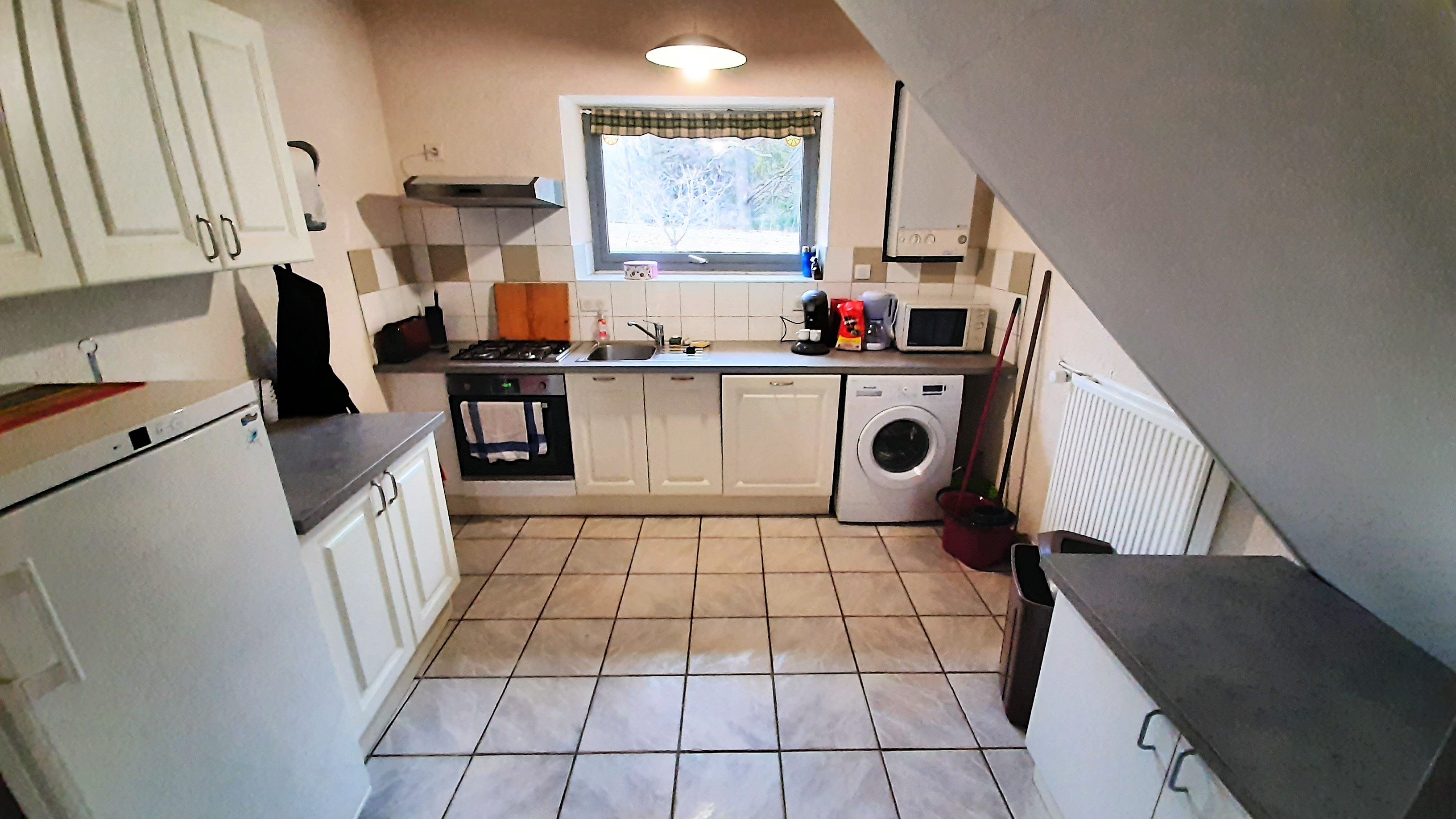 Rez-de-chaussée : cuisine équipée (table de cuisson avec 4 feux gaz, hotte aspirante, four encastré, four à micro-ondes, cafetières dont une Senseo, bouilloire, grille-pain, réfrigérateur, lave-linge, ...). Salon-salle à manger avec TV à écran plat, canapé-convertible, fauteuils, table basse, ... Salle d'eau (2 douches, vasque sur meuble et WC).