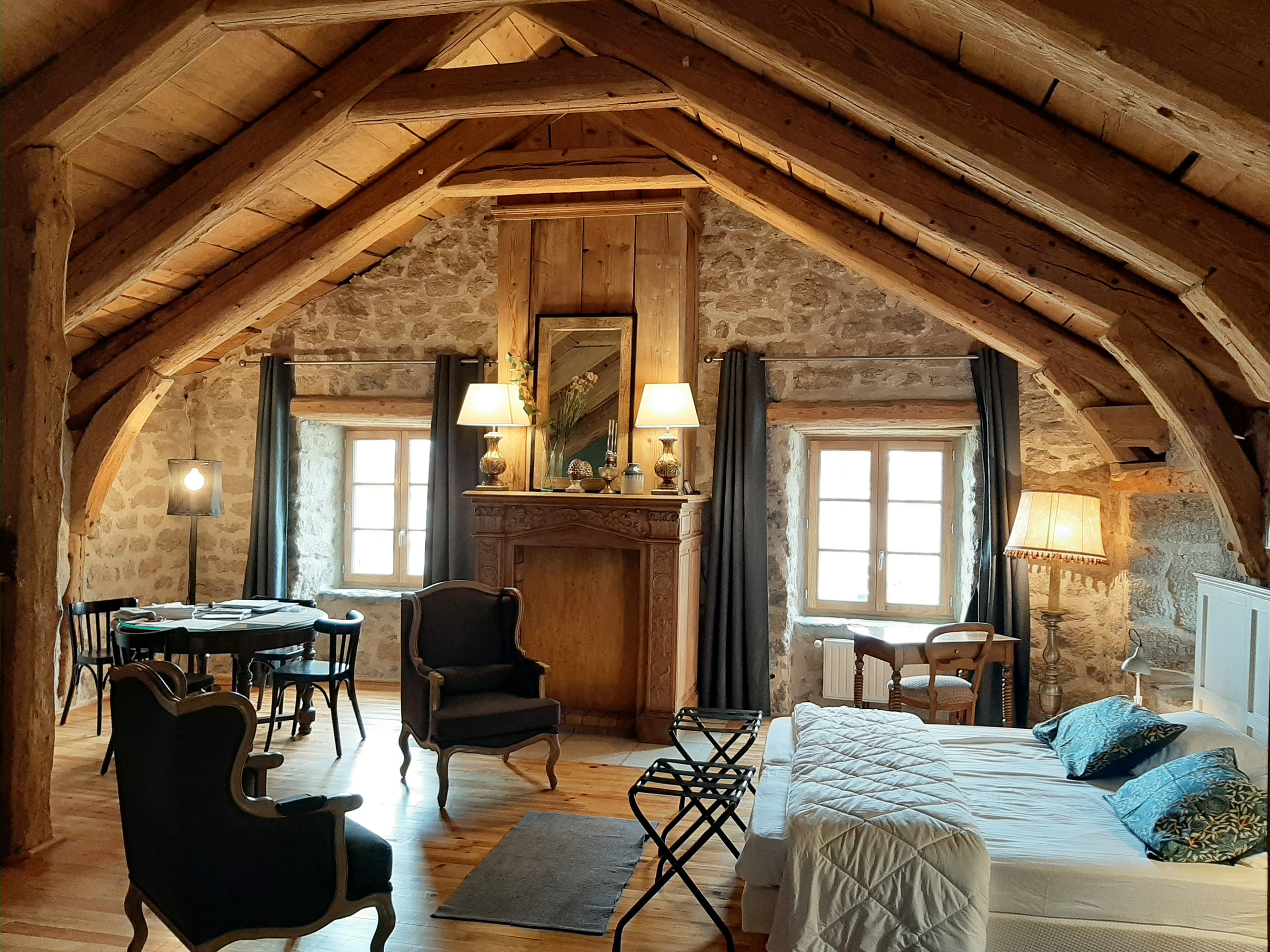 Grande pièce à vivre avec cuisine américaine équipée : table de cuisson (2 foyers à induction), four micro-ondes combiné avec four électrique, cafetières dont une Dolce Gusto (capsules), bouilloire, grille-pain, cocotte-minute, plancha, service à raclette, robot mixeur, réfrigérateur, congélateur, lave-vaisselle, ... , table en bois et 4 chaises assorties, espace séjour avec 2 couchages de qualité (2 lits 1 pers. en 90x200 cm ou 1 lit en 180x200 cm), fauteuils, table basse, tapis, lampes sur pied, ... Bibliothèque. TV avec TNT SAT (chaînes thématiques et internationales). WIFI (connexion gratuite et sécurisée). Nombreux rangements.